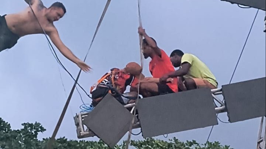 Imagens captadas no local mostram o momento do resgate. Nas gravações, um homem aparece segurando o jovem desacordado sobre a estrutura de som, enquanto outras pessoas ajudam a vítima. De forma improvisada, o trabalhador foi amarrado com cabos e descido com segurança.
